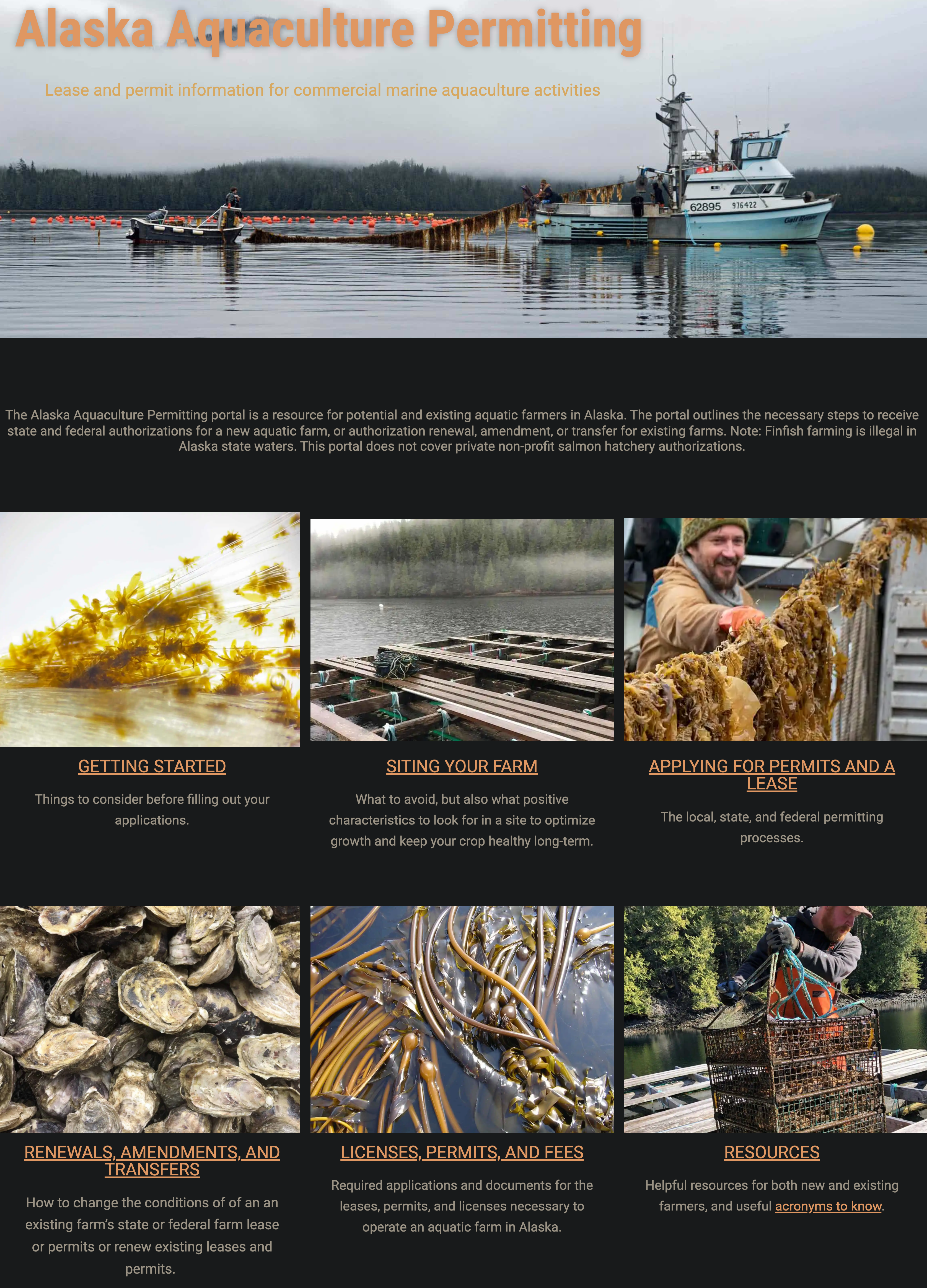 "The portal outlines the necessary steps to receive state and federal authorizations for a new aquatic farm, or authorization renewal, amendment, or transfer for existing farms."