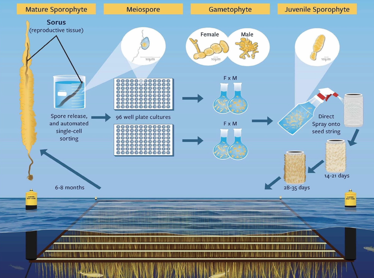 Scientists at Woods Hole, Uconn and Cornell have been working hard to develop a selective breeding program for sugar kelp. The goal of their research is to improve productivity and cost effectiveness of seaweed farming. The figure below shows an easy way to follow their seeding process :