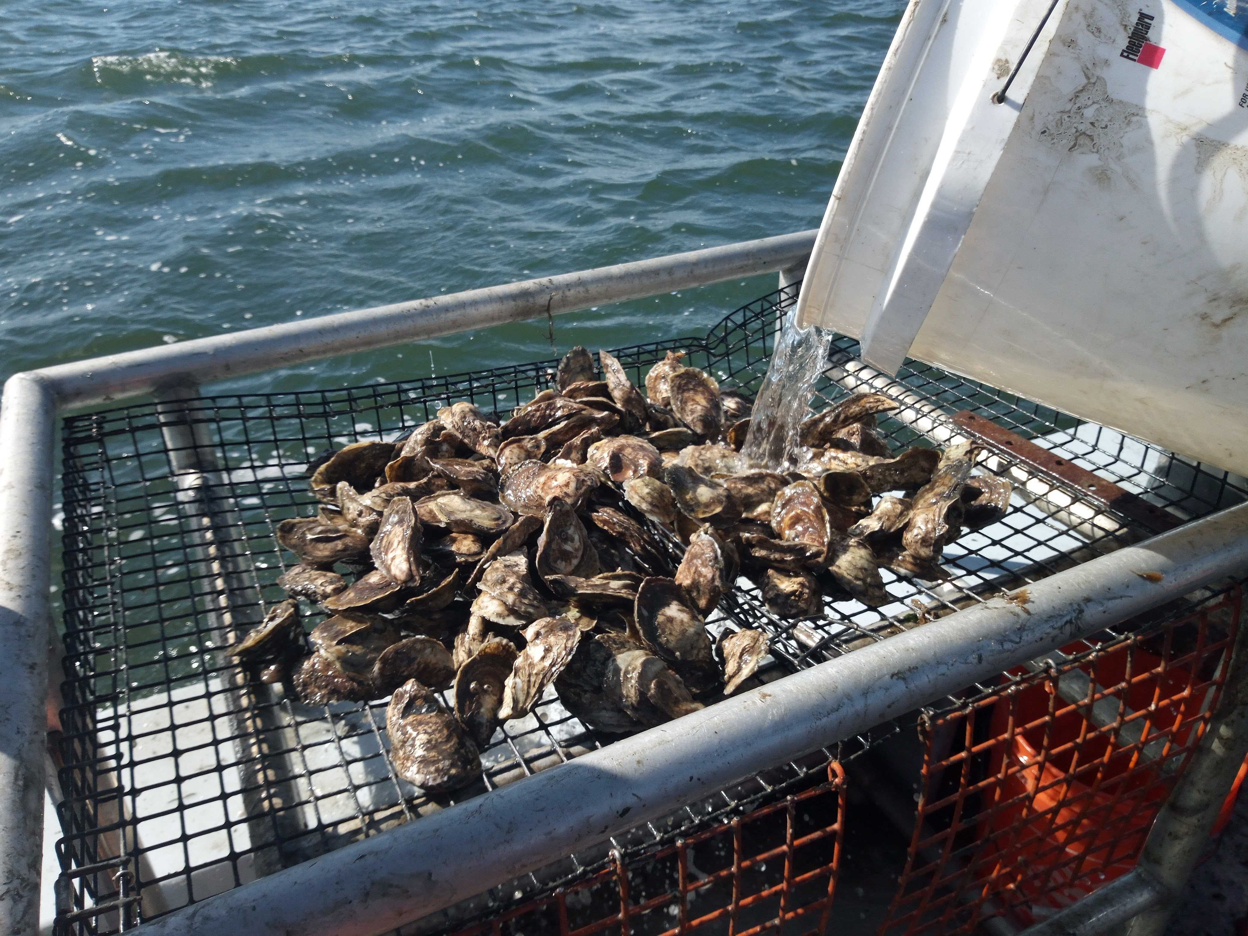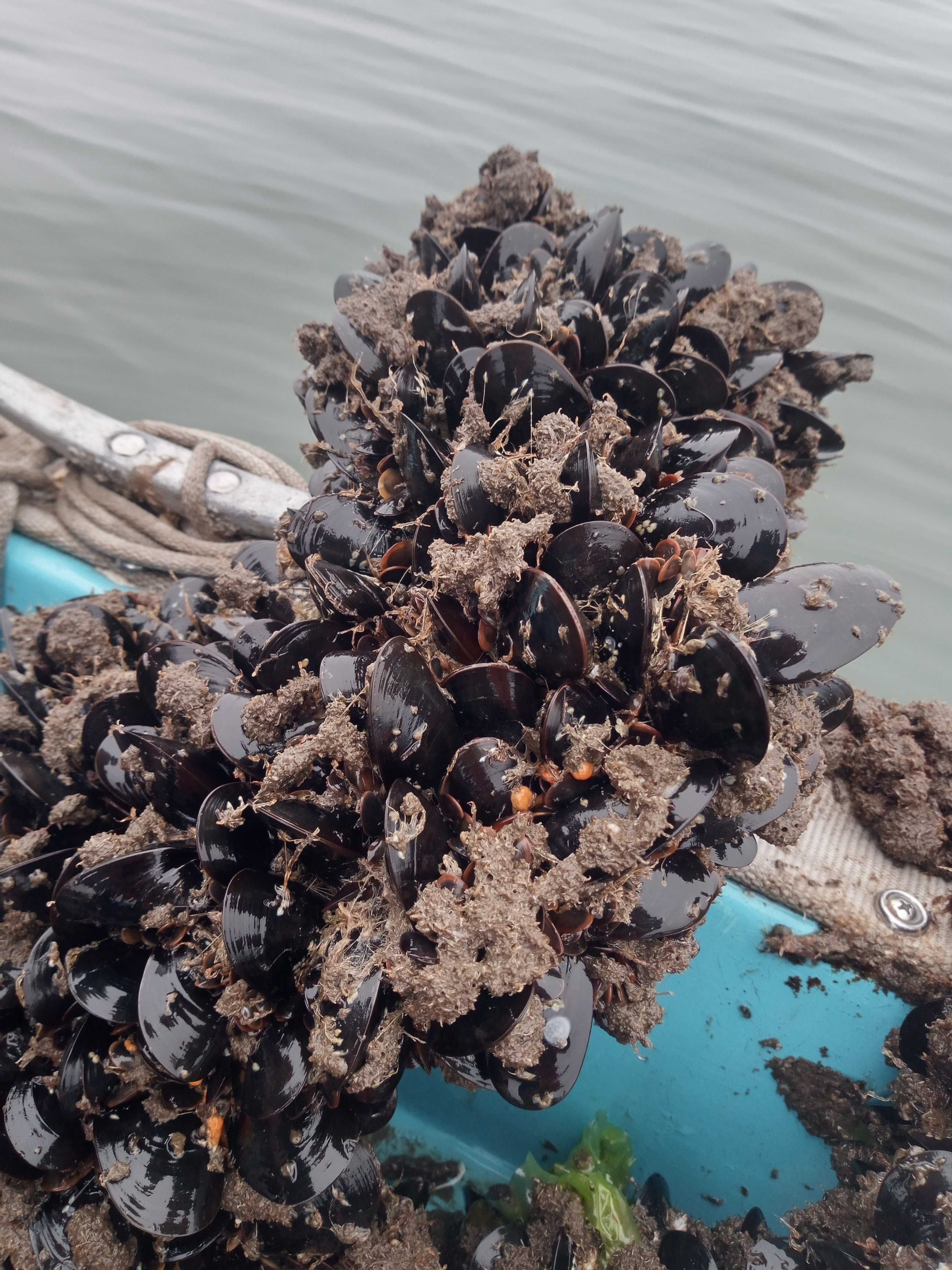 Mussel seed can be purchases from local hatcheries or it can be naturally collected after spawning in the Spring and late Summer. The top image below are mussels that were collected from natural spat in the previous Spring. If you look closely you can see the small oyster spat mixed in with the larger mussels from the previous season.