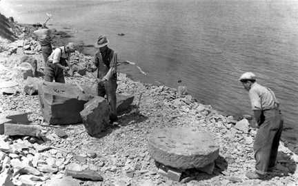 I don't have any pictures of the grindstones, but here are some old photographs from the same quarry with some of the smaller stones that made the grade.