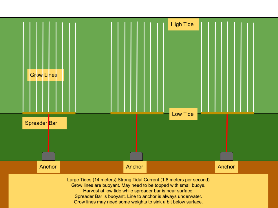 Finally, given the underwater weight of sugar kelp, those lines would need to have flotation to keep things from sinking to the bottom and up where there’s sunlight. Maybe a buoyant spreader bar across the top ends of those lines is called for. Anyway, let us know if you have any luck.