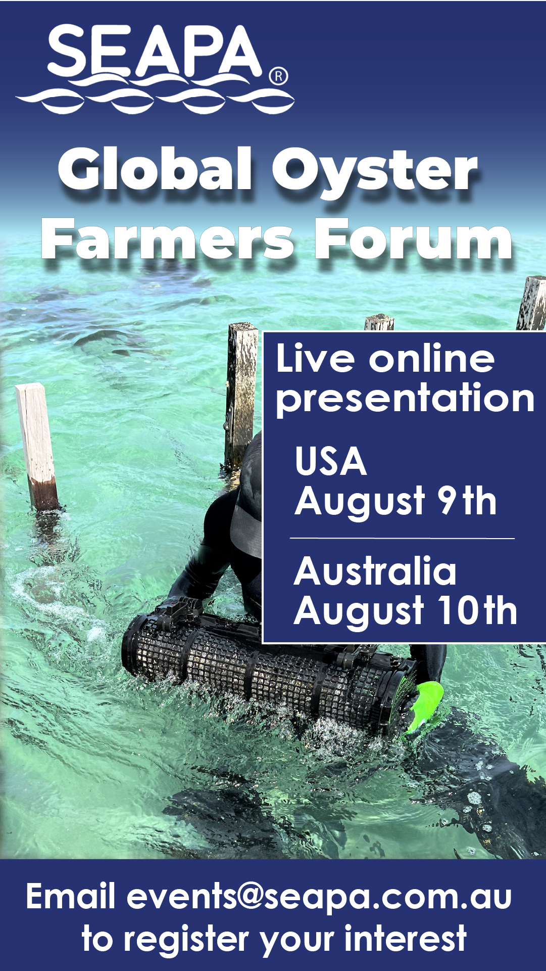 "SEAPA is hosting an industry-first online event on August 9, to interact, learn from and speak with oyster farmers from around the world in real-time. We are calling it the Global Oyster Farming Forum and we are cultivating a variety of presenters who are all innovators within the oyster industry from Japan, Australia and the United States. Our aim is to provide you with the opportunity to engage our global oyster farming community and access their expert knowledge and experiences. Each presenter will have a unique story to tell and you will be able to discuss the different methods, challenges, and solutions used by fellow oyster farmers across the entire Pacific region. You can register your details by clicking on this link events@seapa.com.au and we will contact you with the details for joining the event."