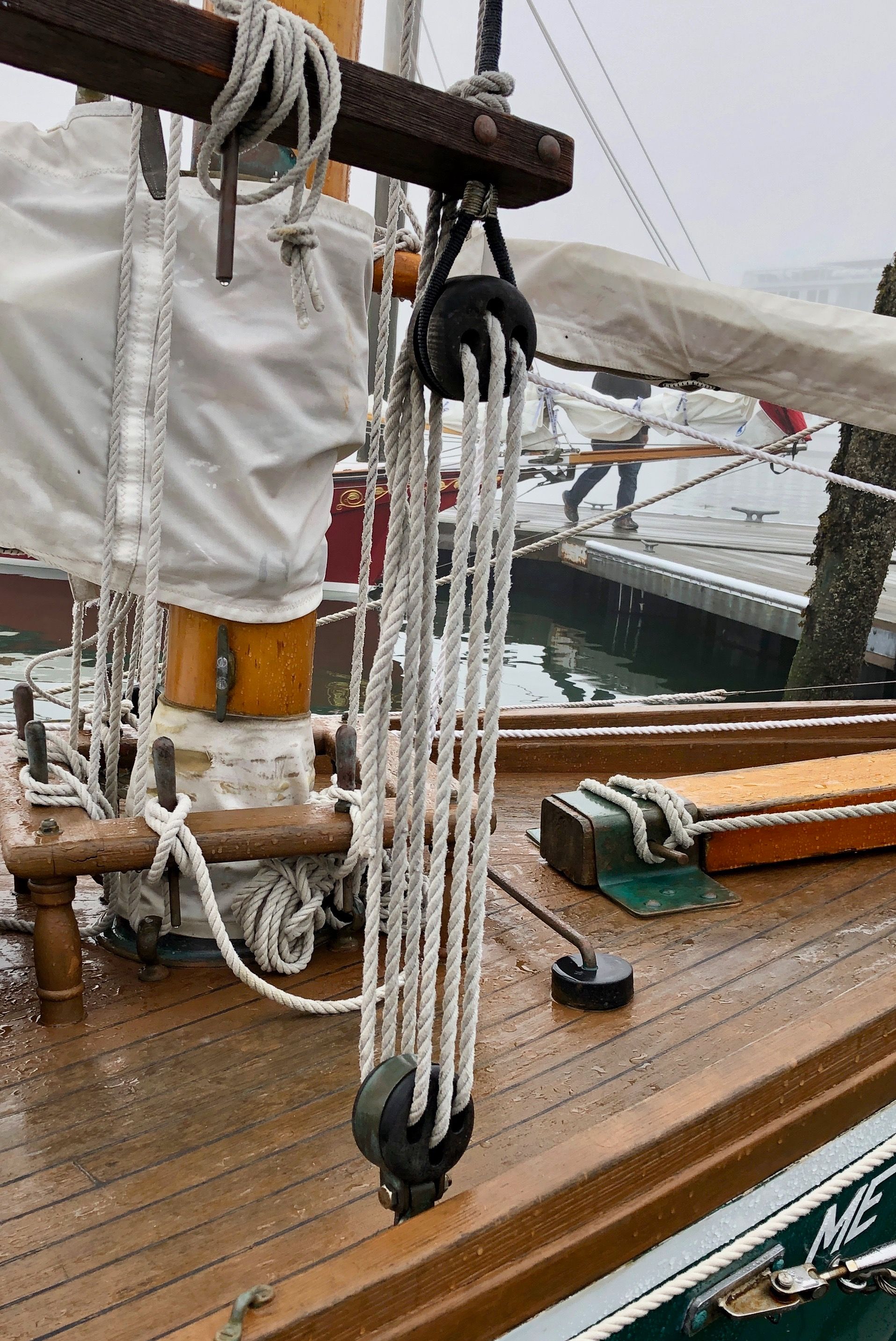 Here is a more reveling photo of the tradition use of deadeyes: this photo taken in Rockland, Maine last summer of a Friendship Sloop, and being used to maintain the tightness of shrouds in place of today's more common turnbuckle.