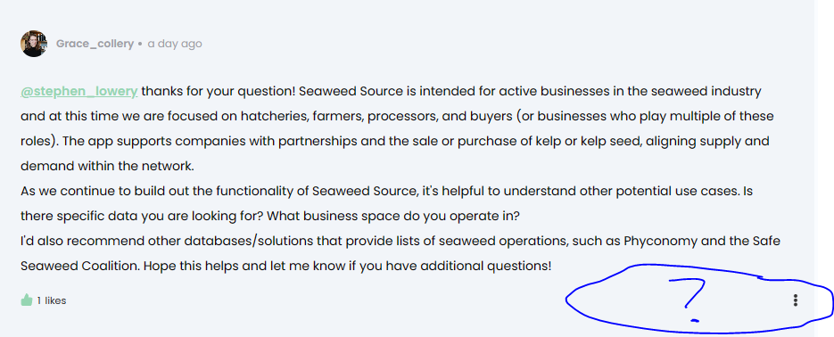 "As we continue to build out the functionality of Seaweed Source, it's helpful to understand other potential use cases. Is there specific data you are looking for? What business space do you operate in?"