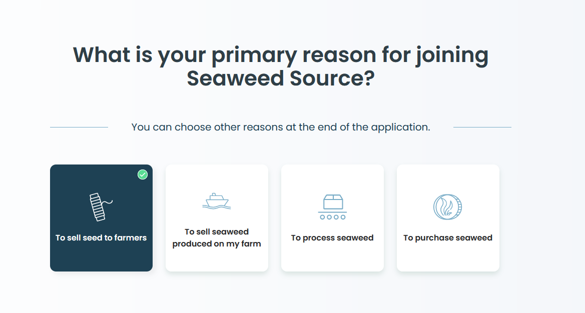@grace_collery, thanks for posting this. Is there a way to view this market-place & directory/database of market participants without applying to use the application? Some of us are researching or working in related/adjacent business-spaces, but we don't fit neatly into the 4 options listed (sell seed, sell seaweed, process seaweed, purchase seaweed) in the application process (see image) and it'd be useful to still have access to the data.
