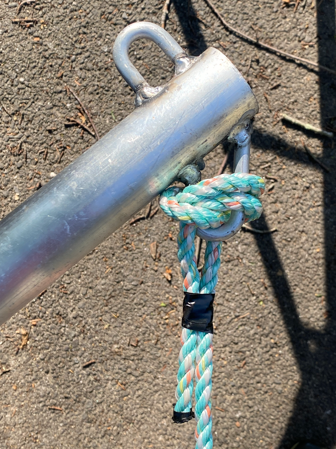 We use 3/8" diameter round bar in 6063 alloy for the bails, as it is more easily bent without cracking. 6063 in this form has a typical tensile strength of 30,000 psi, so at 3/8" diameter the rod's tensile strength is around 3,300 pounds. A good welder can match that when welding it to the pipe, so the arrangement is compatible with rigs that use 3/8" to 1/2" growlines.