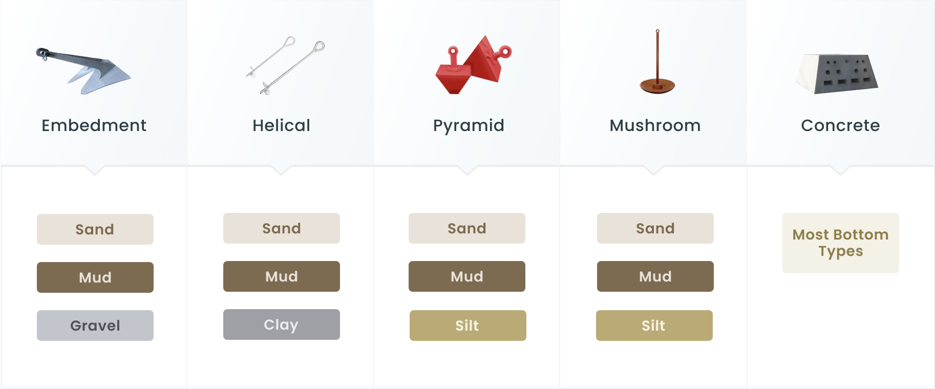 The most important factor to consider when deciding on an anchor type is the bottom composition of your selected site. Some anchors are designed for specific bottom conditions, and if they’re deployed in the wrong environment, they won’t perform as intended. For example, a helical anchor might work great in sand but could dislodge from loose gravel. This image shows a breakdown of the bottom types recommended for each type of anchor. Knowing the consistency of the seafloor below your site will help you rule out certain options early on.