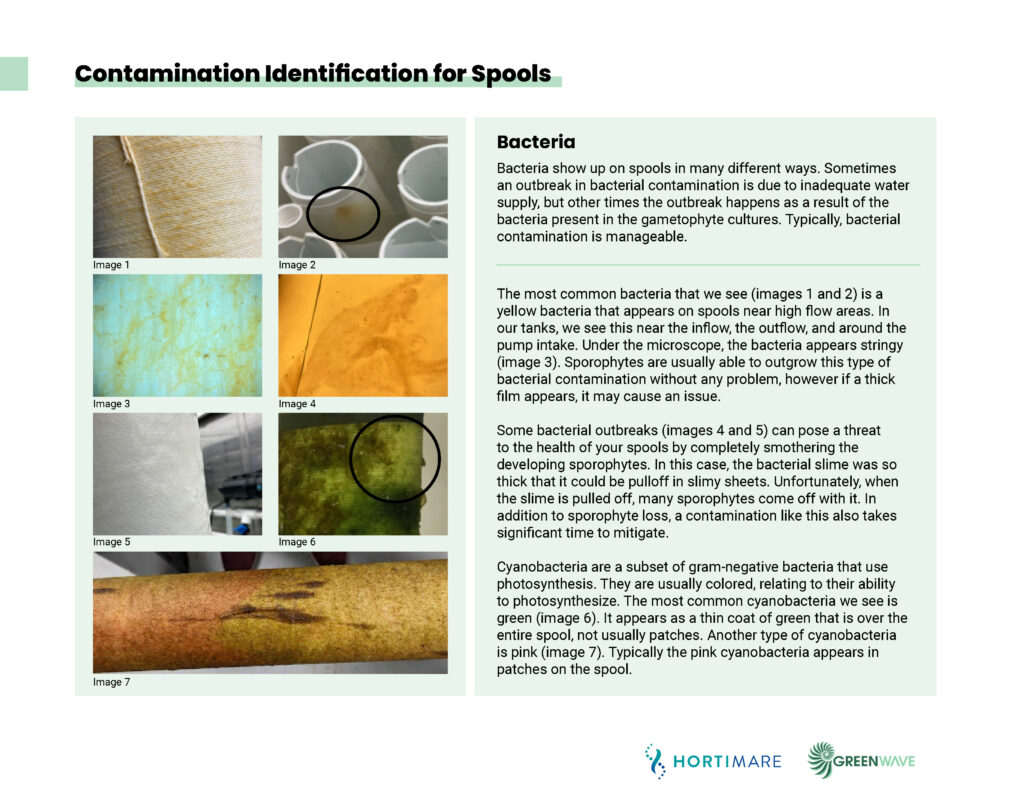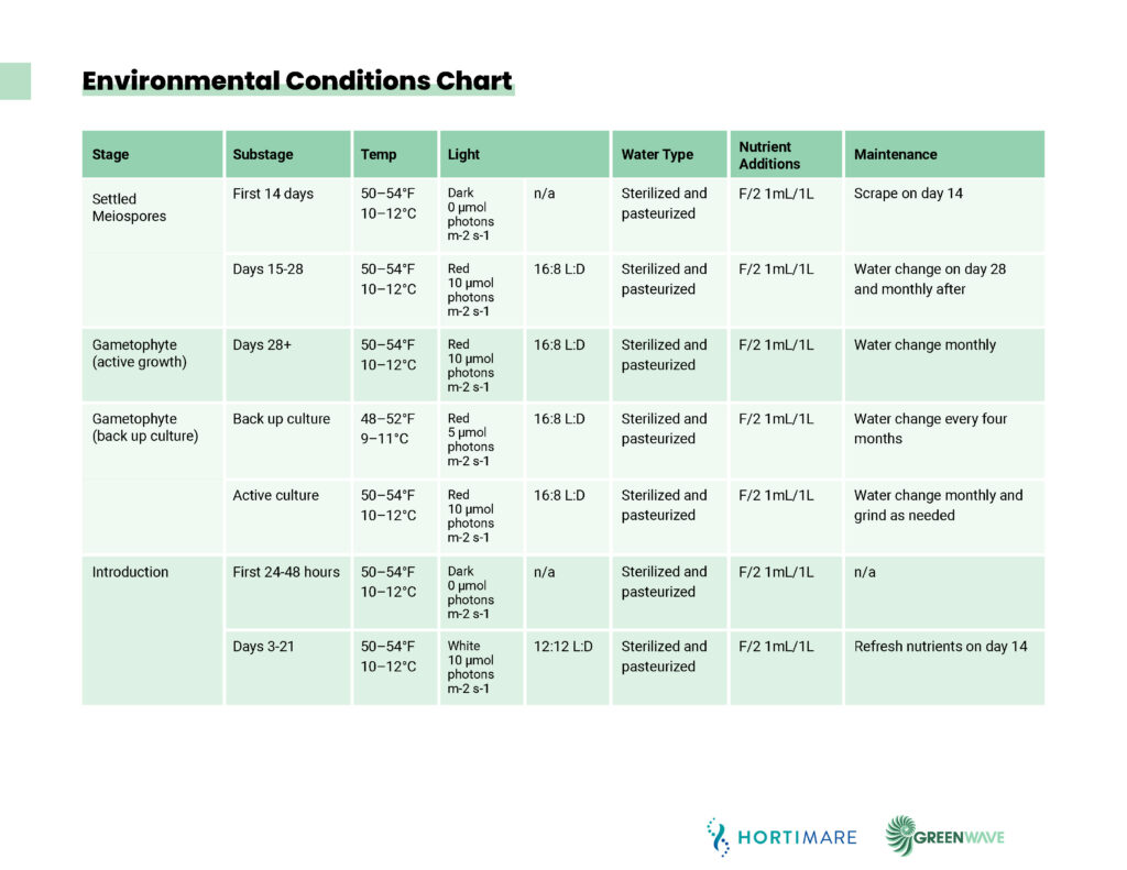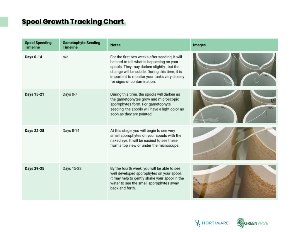 The care for gametophyte-painted spools and spore-seeded spools differs slightly, but the general rules remain the same based on the life-stage of the seed, which can be assessed under the microscope. Water quality, light levels, and nutrient levels can all have significant negative effects on the spools if they are wrong. When sporophytes are just forming, stressful conditions will have a bigger impact on their development than when they are grown out. If the light is too high, the sporophytes may bleach, but if it’s too low, the sporophytes will grow too slowly and the total time in the nursery will increase. More time in the nursery means more resources used. There is no major risk to the sporophytes of the nutrients being too high, but excess nutrients may allow contaminants to grow faster and also result in wasted materials. Use the Environmental Conditions Chart to know what conditions are right for each spool stage.
