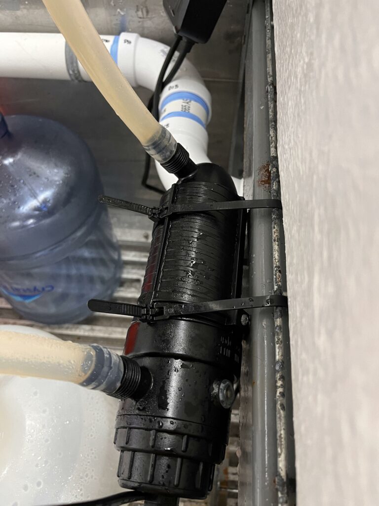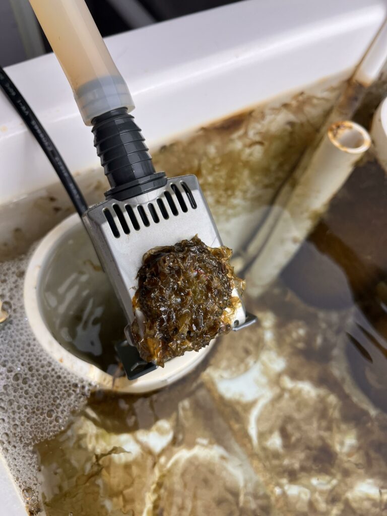 This water pump from a nursery tank is clogged with sporophytes.The intake should be cleared out using a clean brush or paper towel.