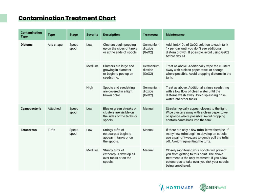 Check that your light timers are working weekly. Adjust the light levels and cycles for your tanks according to the Environmental Conditions chart. Use a full spectrum PAR meter to measure this. GreenWave uses this Apogee PAR meter. Measure the PAR from a position that is similar to the spools’ positions. At GreenWave, we use top lights so we measure the par from the top of the water column, about 1–2 inches below the water surface.