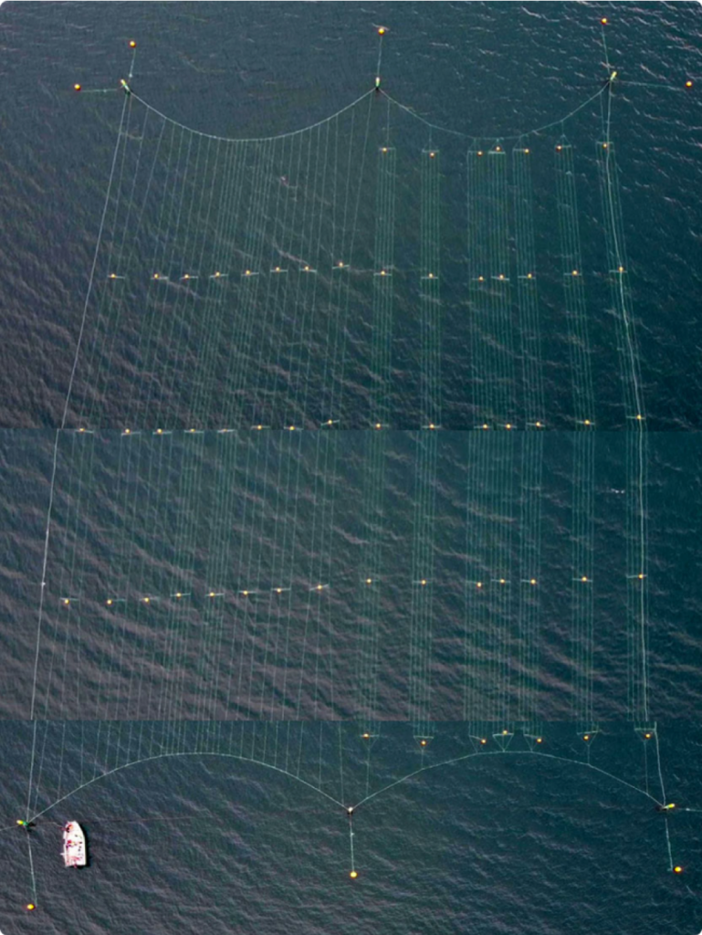 We have included this array type to give you a visual of the full range of farm designs for kelp farming, but we do not recommend the use of this design for first-time farmers. It requires significant marine engineering expertise to design and install correctly, as well as substantially larger gear and equipment. For these reasons, this design is not supported in the Farm Design Tool.