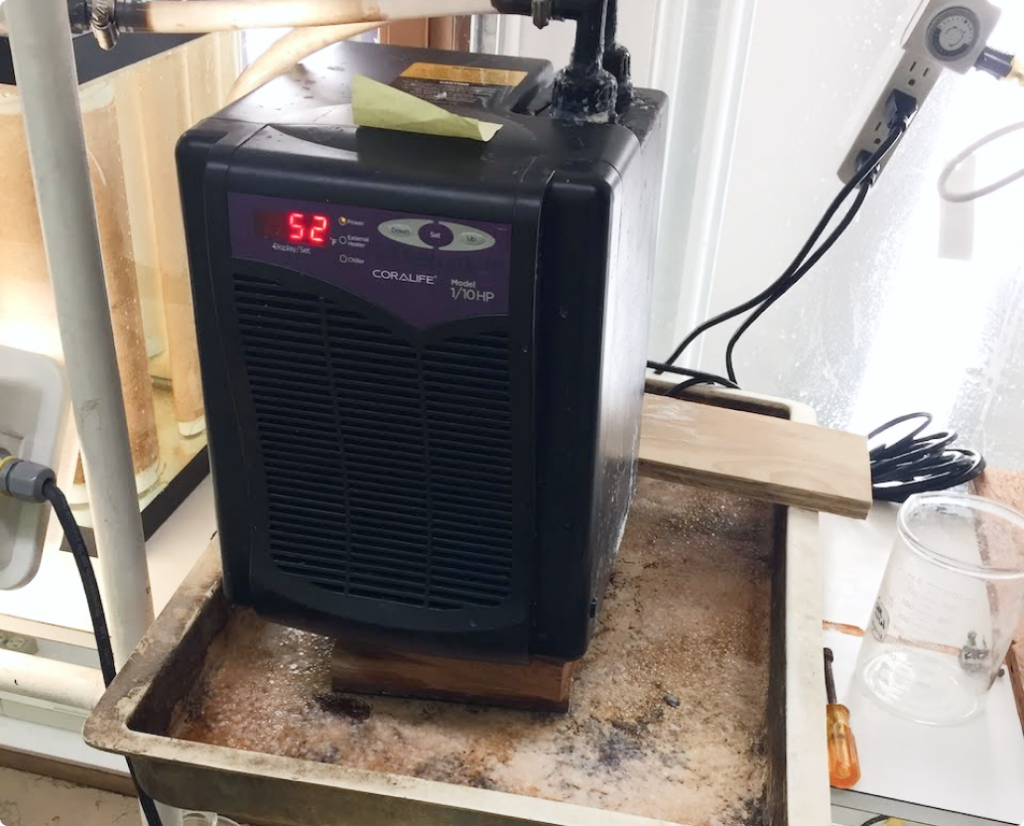 Water temperature is one of the most important parameters for your kelp seed. You should do a daily check of your chillers and/or air conditioning to make sure they are operating properly. Use a thermometer to confirm that each tank is within the optimal 50-52°F (10-12°C) range. GreenWave has switched to a refrigerated shipping container nursery design outlined in the Seed Production Pathways to Scale course rather than using chillers. This chills the air and water in a cooling envelope and has made nursery operations significantly easier and tank temperatures to be more consistent. It has also helped with contamination mitigation because there are no small pieces to clean like in the chillers.