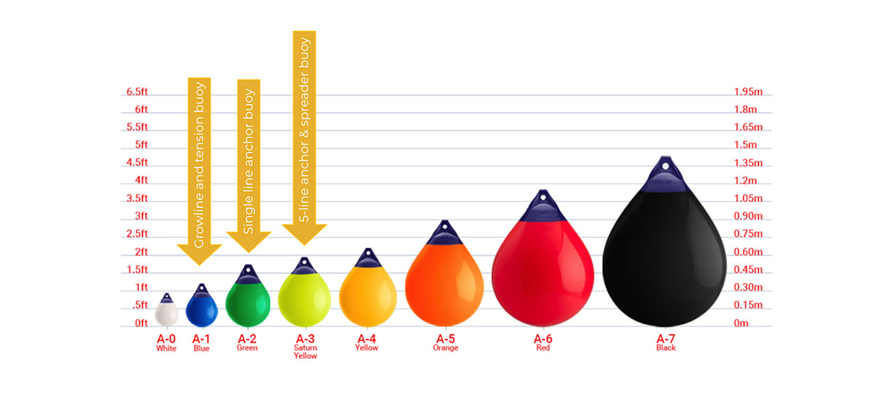 - A-2 buoy (16″-20″ diameter) for anchor line buoys
