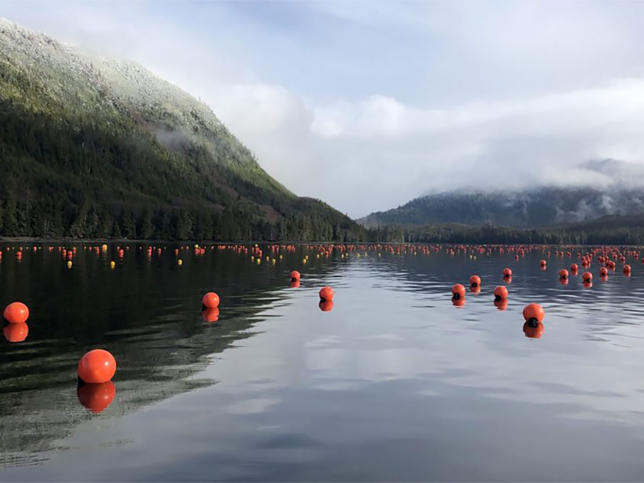 Another important point of consideration is the color of your buoys. Often, buoys are the only portion of your farm that’s visible from the surface of the water, so you’ll want to consider your surroundings and the social context of your farm when making this choice. The photo on the left shows one of the arrays on the GreenWave farm, which is located just off the coast of a densely populated part of Connecticut. There, we’ve chosen to use black and white (more neutral colors) to minimize the visual impact of the farm. The photo on the right is of a remote farm site near Craig, Alaska where there are few residents. There, having brightly-colored buoys makes sense to clearly mark the gear to passing boat traffic. You also could also consider using different colored buoys to signify different things on your farm. For example, yellow is often used to signal caution on the perimeter of a site.
