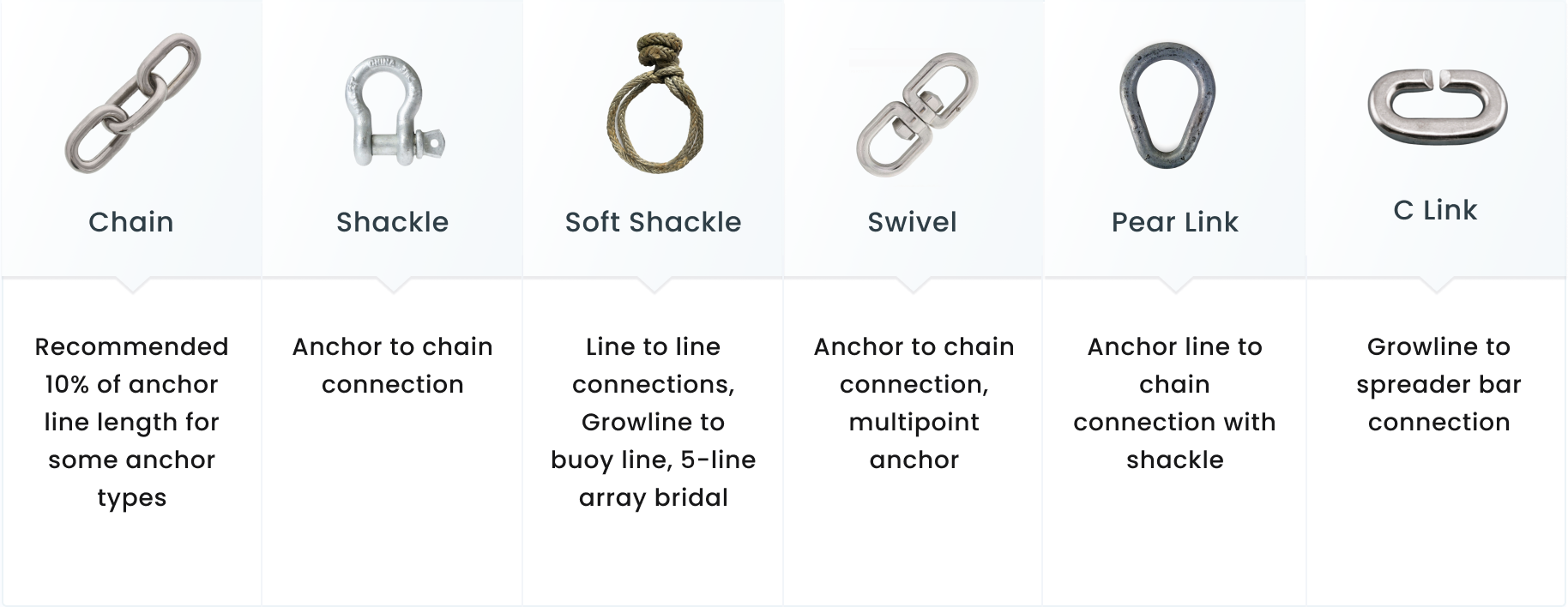 This graphic represents common pieces of hardware used in kelp farming. Most of the hardware tends to be concentrated down towards the bottom of the system, near or attached to the anchor.