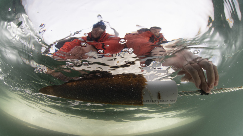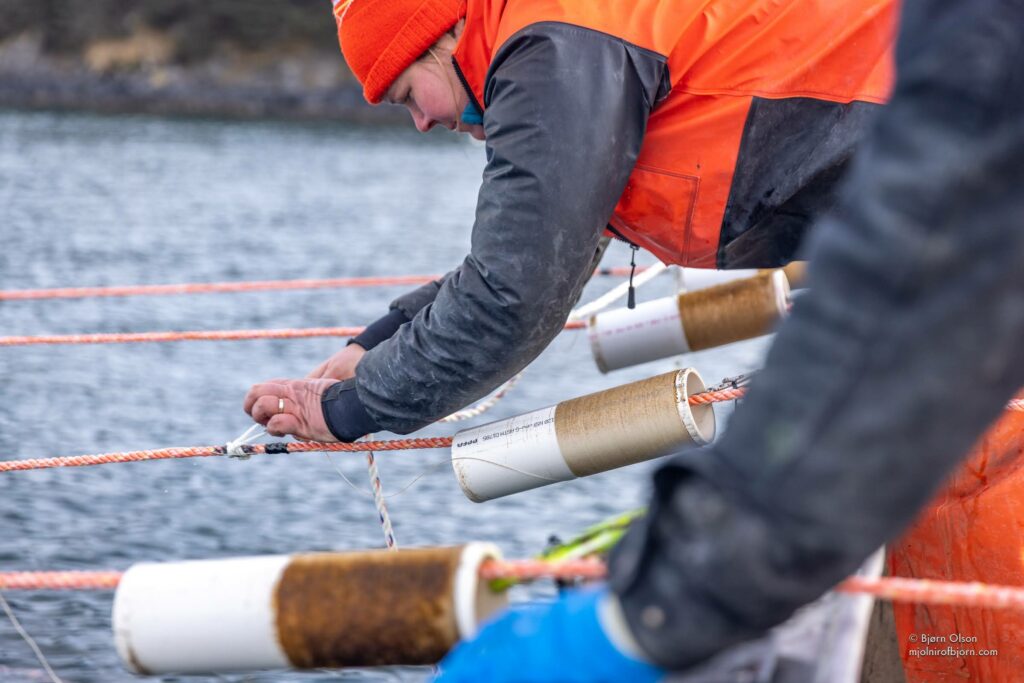 If for some reason you must outplant in colder weather, try your best to minimize the time the kelp seed is exposed to the air. If the spools are wrapped in paper towels for transport, consider unwrapping them in a warmer environment and placing them in a bucket of raw seawater for final transport to the farm site. This will reduce the risk of the paper towels freezing to the blades when the seed is exposed to the cold air. As you’re working the line, try and keep the seed underwater as much as possible by holding the spool below the surface during any time you’re not actually unspooling.