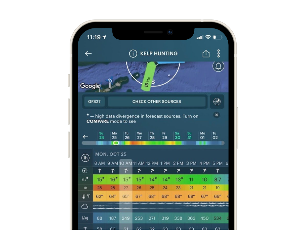 If you’re using divers to collect your sorus tissue, checking on the strength of the current at the site is also very important for their safety. If the kelp bed you are visiting is in an exposed or high-energy area, you may need to target slack tide for collection and check the surf report; high swells will limit access to certain areas. The strength of the wind can also impact the diver’s visibility, so low winds may offer a more successful collection.