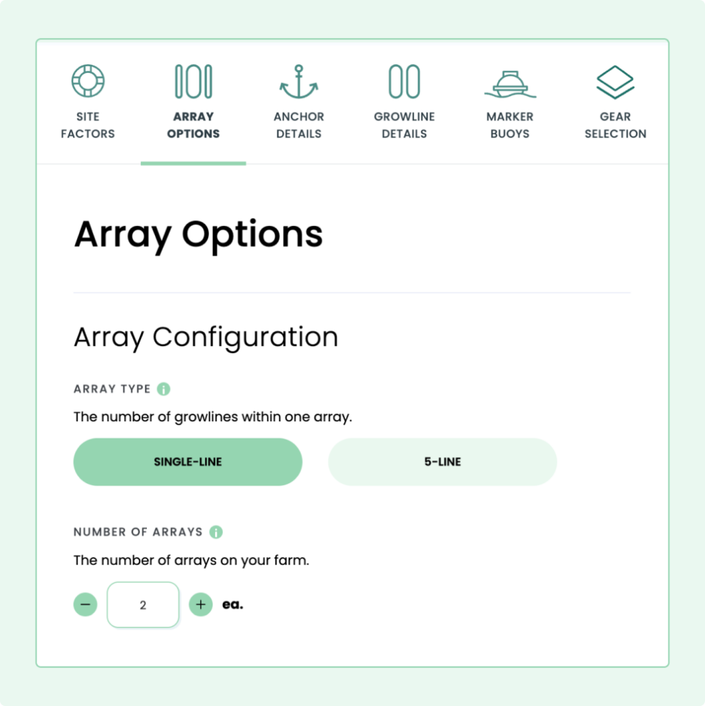 But, all of these arrays will ultimately need to match the characteristics of your site. This is where the Farm Design Tool comes in. As you change the depth of your site, the current velocity, or the bottom type, the recommended anchor type, gear area, and startup costs will adjust.