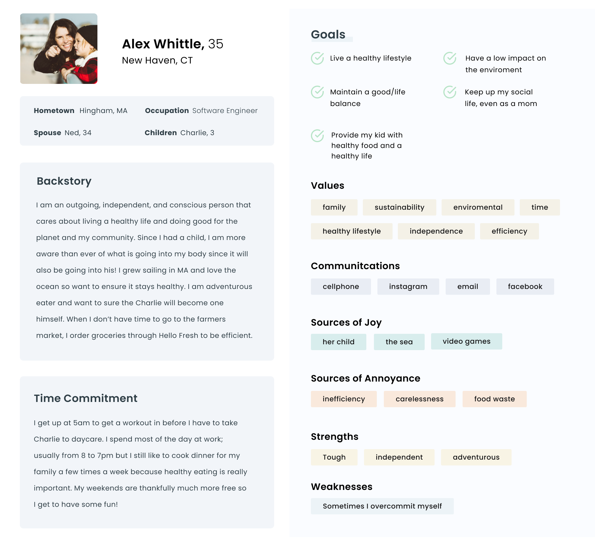 Below is an example of a persona developed for a kelp and shellfish Community Supported Fishery (CSF) product. You can see that a lot of thought has gone into who this person is and what their life is like. When completed to this level of detail, a persona becomes a tool to help make marketing and sales decisions based on the question, “Will Alex like it?”