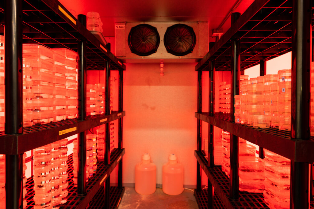 Gametophyte culturing is a method that capitalizes on the unique life cycle of kelp. Instead of wild kelp spores attaching to and growing directly on seed string, they are instead released and allowed to settle in a container, where they will develop into the next stage of life—gametophytes. During this process, it is critical that the containers are stored under red light. The red light prevents the gametophytes from becoming reproductive and developing into sporophytes (the life stage that is outplanted on the farm).