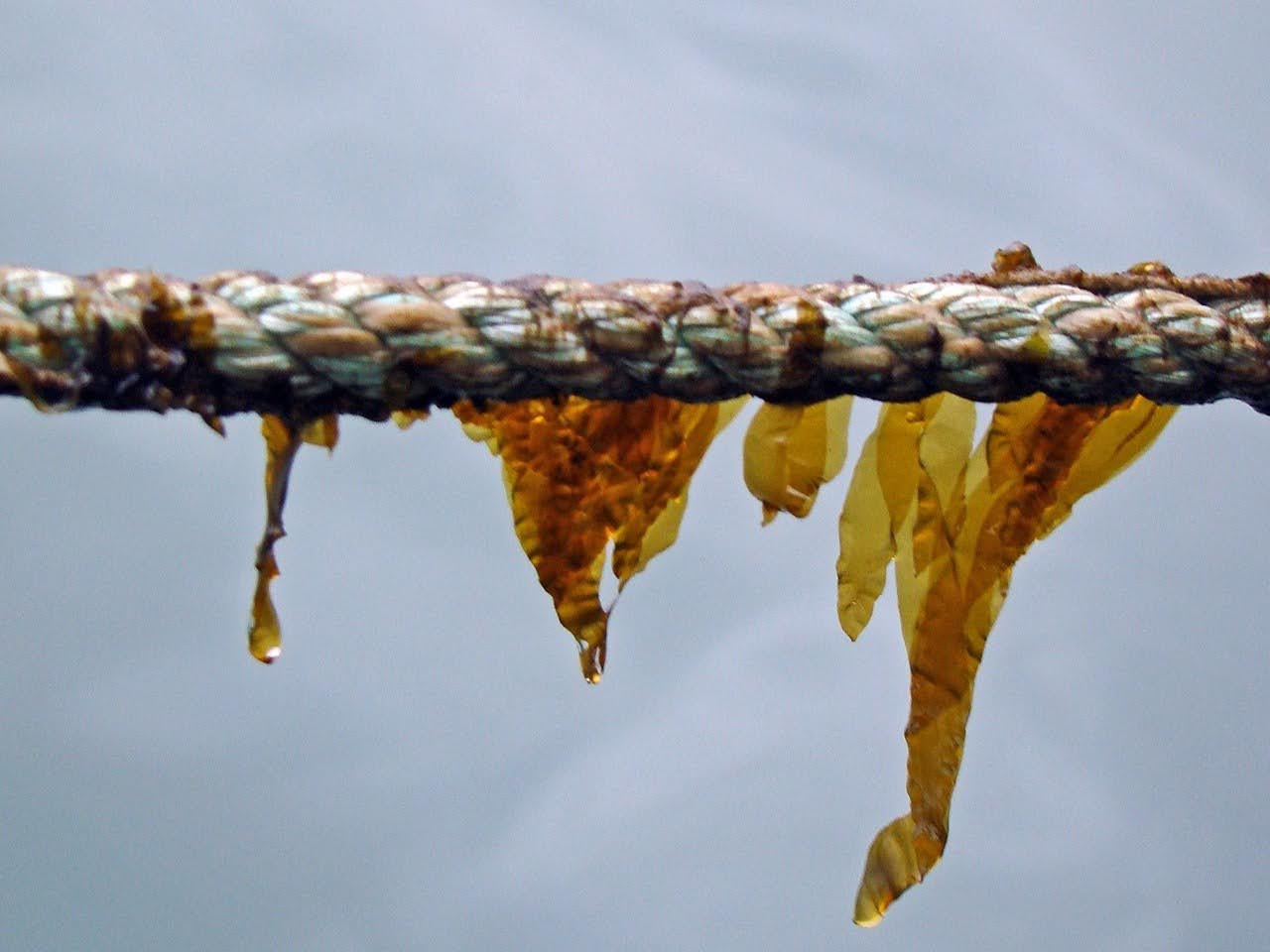To do this, we recommend designating three easily identifiable spots on different growlines on your farm that you can return to each month to take measurements. It may help to mark them with something visible like the surveyor’s tape. Use a ruler or tape measure to measure a 12-inch section of growline. Inspect the kelp for biofouling and take a picture. Cut the kelp off the growline from this section and place it in a mesh bag. Use a hanging scale to record the weight.