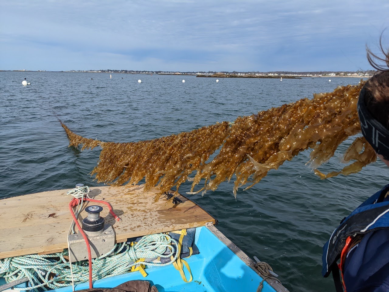 You likely won’t see any growth on your lines for the first month, but by late December or early January you should see 1-inch long sporophytes (kelp blades) start to emerge from your growlines. If the air is near or below freezing, we recommend trying to resist the urge to pick up your growlines every time you visit your farm. Keep your kelp submerged as much as possible while it’s still young and vulnerable.