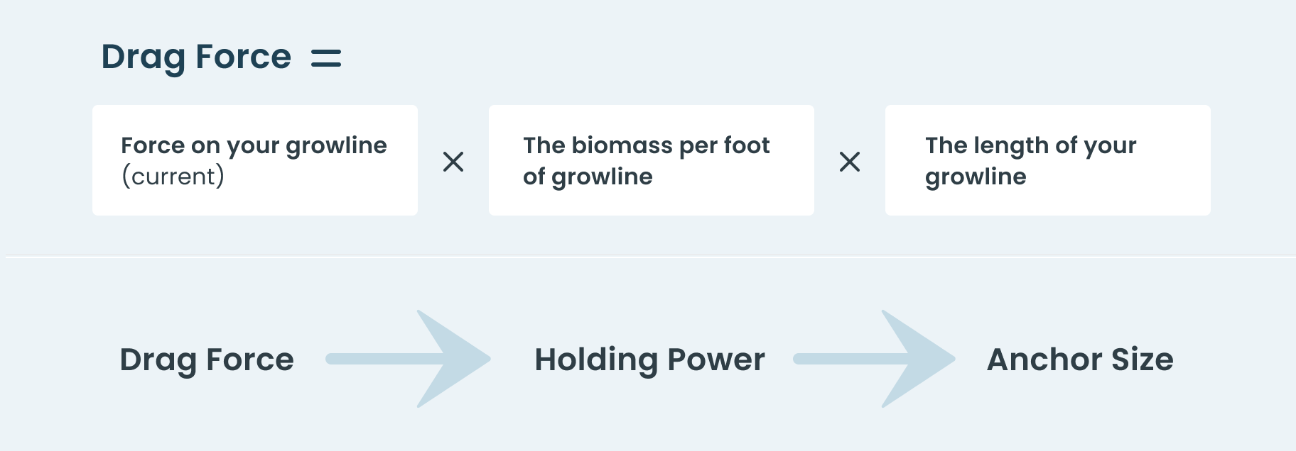 When your gear is in the water, it will have to withstand a variety of forces from the marine environment. Your farm’s exposure to prevailing wind and weather, the current velocity, the tide, and the weight per foot of kelp on your growlines will all contribute to the cumulative drag force placed on your gear. To counteract this, your anchors should have enough holding power to withstand the drag force and secure your gear in place. Holding power is also sometimes called breakout force; it is commonly measured in pounds.