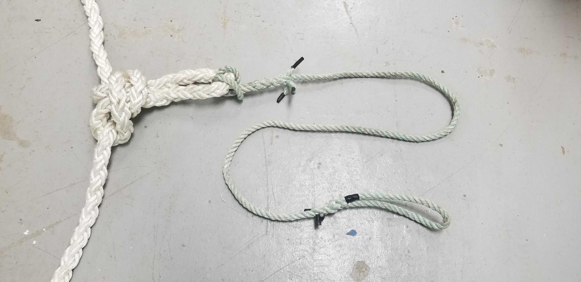 Pigtails are short lengths of line (usually 10 feet or shorter) with an eye spliced into either end. They can be used to connect different components of the array together—such as the anchor line to the growline, which gives an access point to the growline without disturbing the kelp and makes the system easier to access when it’s under tension. Pigtails are also commonly used for the 5-line array to connect the growlines to the spreader bar.