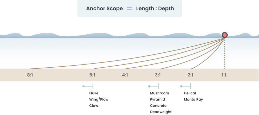 To determine the length of your anchor line, you’ll first want to confirm the depth of your farm site at mean high water. Travel out to your site at high tide, and measure the depth of the spot where you intend to install your arrays with either a depth sounder or a weight on a string. Based on your measurements and the type of anchor you’re using, multiply this dimension by the recommended ratio to gain the appropriate scope (refer to the Farm Design Tool or the Anchor Lesson in the Gear Selection course for more details on the recommended scope of your anchor lines). Whatever distance you calculate, we recommend adding an additional 20 feet of length to leave space for knots and tails on either end. You can always trim the tail later.