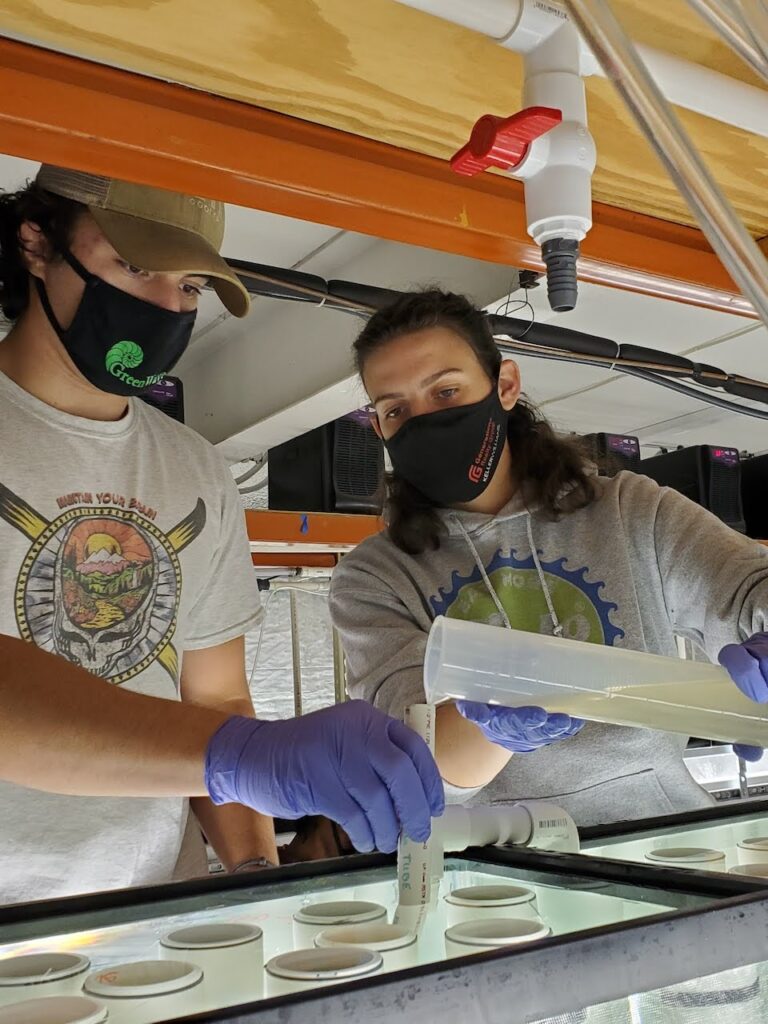 If you control the temperature of your tanks by chilling the air in your hatchery room, then you’re all set! If you use chillers, it is not recommended to run the pumps in your tanks during the 24 hour settling period, as the water flow may damage the spores or prevent settlement. As a work-around it’s possible to prechill the filtered seawater in your seeding tanks to 50°F/10°C the night before. The day of seeding, chill your room to the coldest setting (at GreenWave, we set our thermostat to between 55 and 60 °F). Just before you add spore solution to your tanks, turn off the pump and chillers. If possible turn off all lights and any possible heat sources in the room to prevent a significant increase in temperature. The ambient temperature may rise a few degrees over the settlement period, but the slow increase in temperature does not seem to be detrimental to settlement.