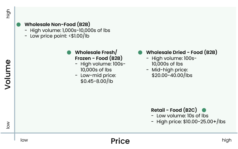 Even if you have a market in mind, it likely won’t be able to take all of your product. When you think about sales channels for your kelp, we really recommend adopting a “whole leaf” marketing strategy. Think about different ways you can get value out of different parts of your kelp, salvage value if you have a low-quality harvest, and, in general, diversify your sales streams.