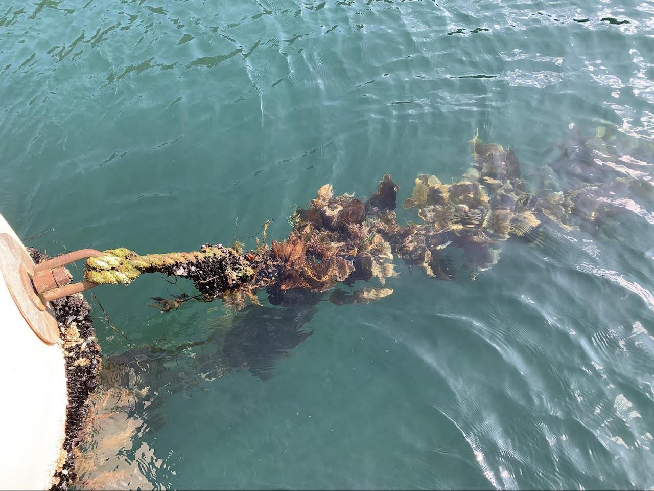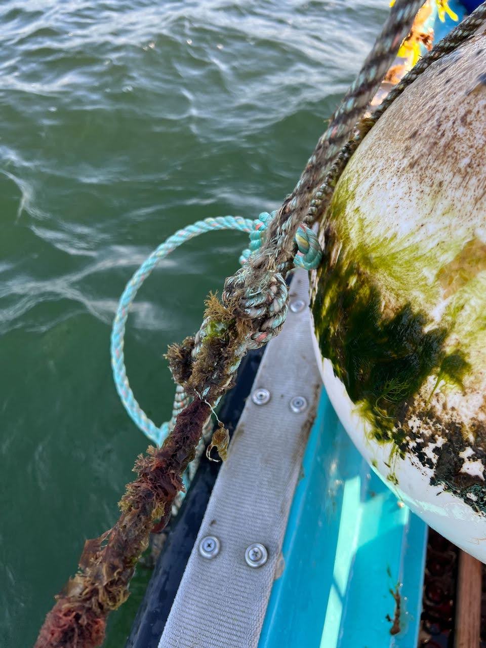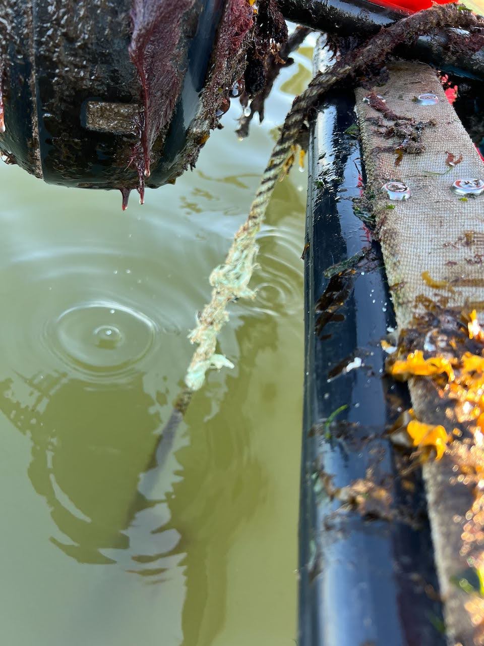 As you’re checking your lines for chafing, also keep an eye out for fouling. Biofouling on your kelp is a serious issue that can quickly degrade the quality of your kelp. Any sign of biofouling on your kelp is an indication that you should harvest quickly. Read more about spotting signs of biofouling on your kelp in the course on Harvest.