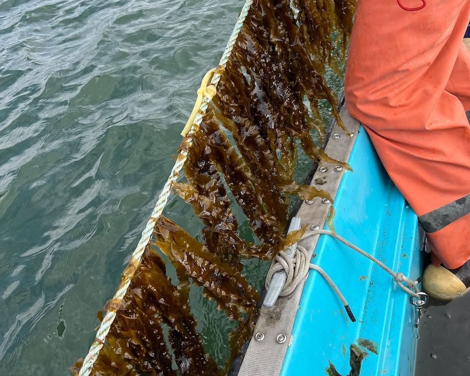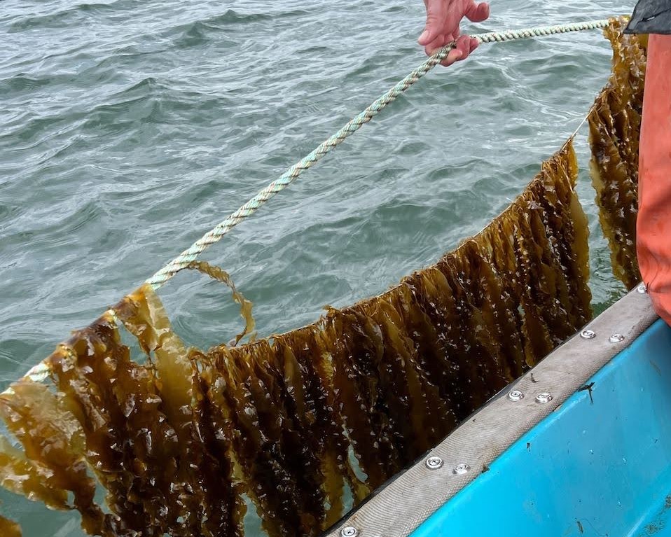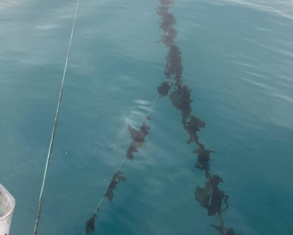 If you spot a loose or broken seed string on your growlines you’ll need to fix it by tying or lashing the seed string back to the growline. This will encourage the kelp’s holdfasts to attach directly to the growline, as opposed to continuing to grow on the seed string alone. At GreenWave we use surgical tubing to do this, but twine also works well. For the best chance of preserving your crop, you’ll want to make this repair at every spot you see broken or sagging seed string.