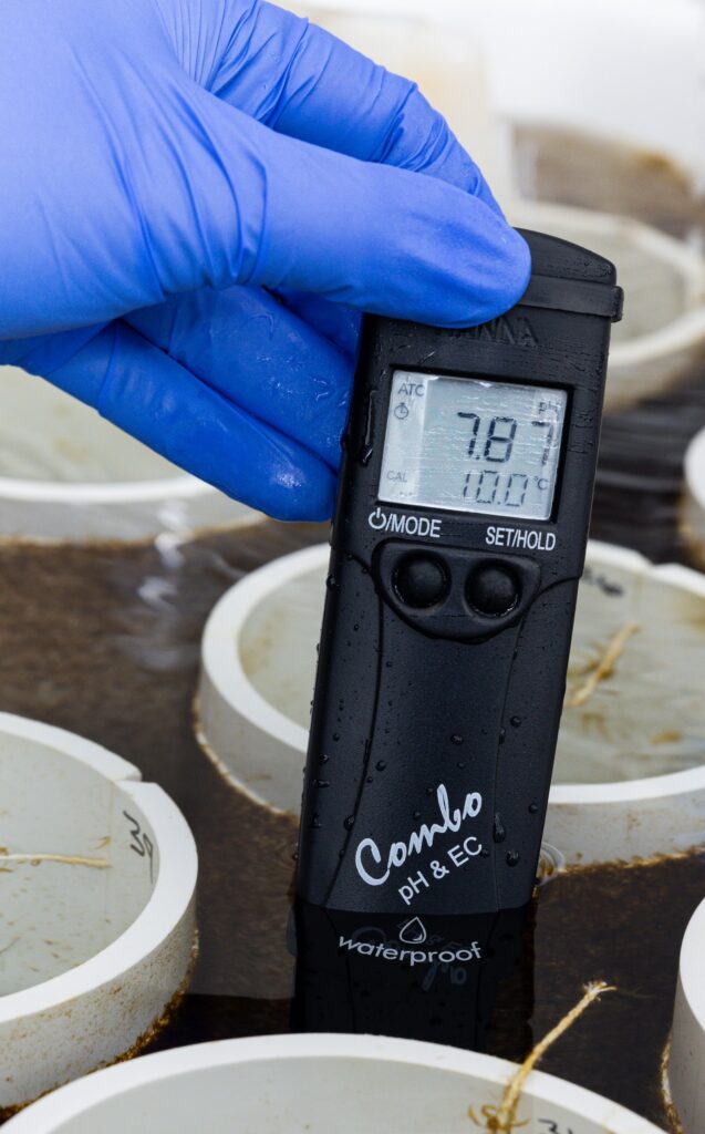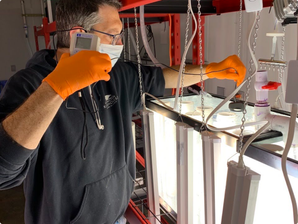 - Light. Understanding the light levels within your tanks is most important during the setup phase, so you can be sure your seed will be receiving the proper amount of light. Check that your light timers are working weekly. Adjust the light levels and cycles for your tanks according to the Environmental Conditions chart. We’ll describe more about gradually changing the exposure to light in Lesson 4: Growth Observations. Use a full spectrum PAR meter to measure this. PAR stands for “Photosynthetically Active Radiation” and is the spectrum of light that kelp uses for photosynthesis. GreenWave uses this Apogee PAR meter. Measure the PAR from a position that is similar to the spools’ positions. At GreenWave, we use top lights so we measure the par from the top of the water column, about 1–2 inches below the water surface.