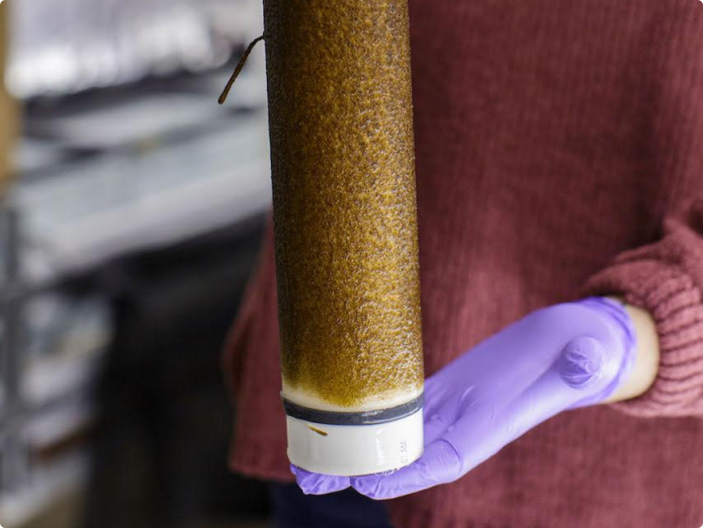 Between weeks five and seven, the blades will start to reach the optimal outplant length of 2 mm. The golden color from the week prior will be replaced by a beautiful, dark brown, and the blades will be easily identifiable. It is okay to keep the spools in the hatchery for a little longer beyond the six to seven-week mark, but once the lengths of the blades start approaching 4 mm, the blades will quickly start to starve and lose color, taking up the tank’s nutrients much more quickly than you can replenish it.