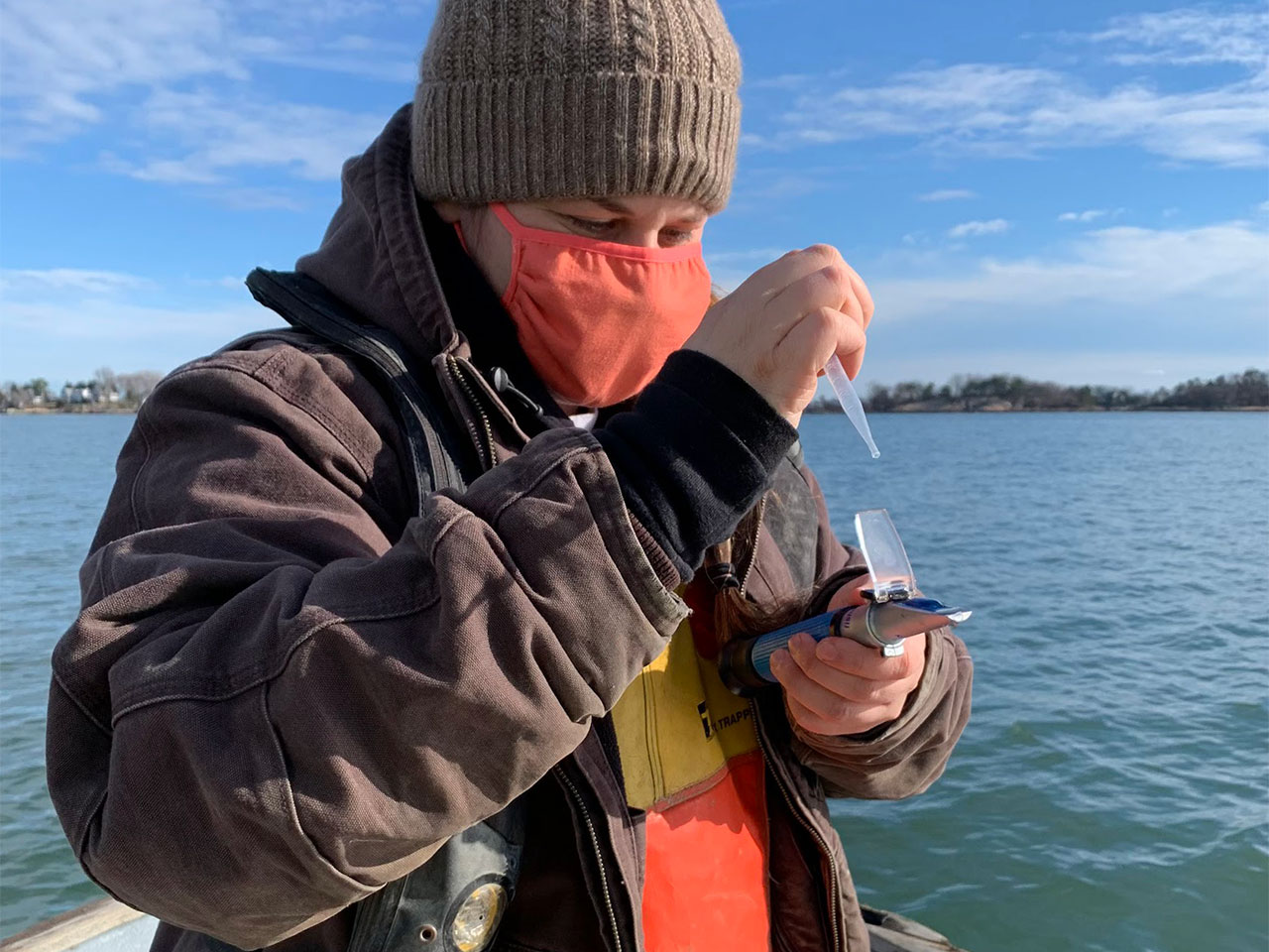 Keep in mind, when collecting your sample, that some sites could have a freshwater lens at the top of the water column from snowmelt or glacial runoff. The water could be significantly more saline just a few feet below the surface. Because you ultimately want to know the salinity at the depth where your kelp will grow, you can use an at-depth water sampler, such as a Niskin bottle, to capture a water sample below the surface.