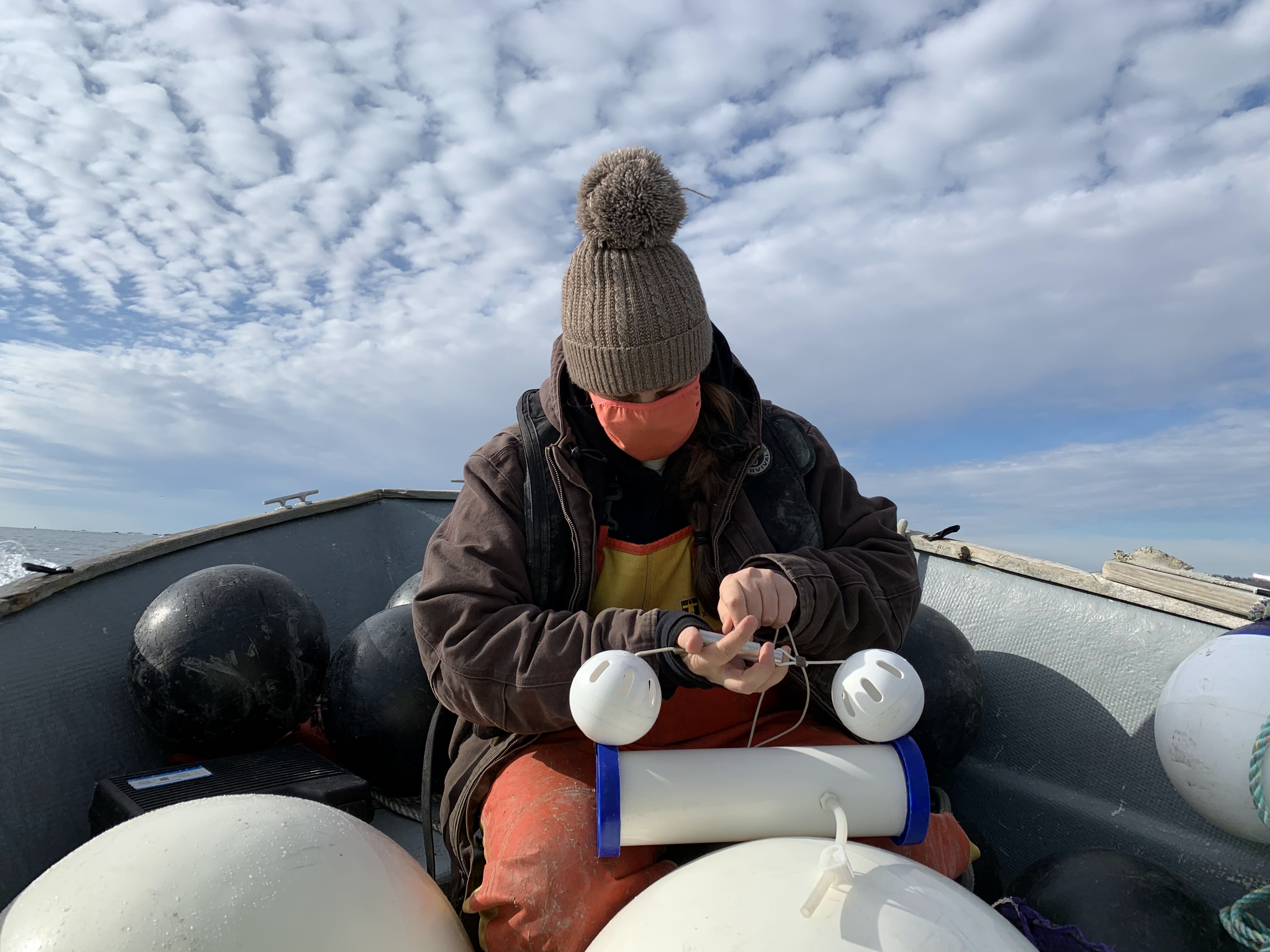 Niskin bottles are expensive, so we use a makeshift alternative made with a piece of PVC tubing, two wiffle balls, and a spring-loaded release. The tube is lowered down into the water to the depth where kelp is grown, and the release triggers the balls to close the tube, capturing a water sample. The sample can then be pulled to the surface and tested.