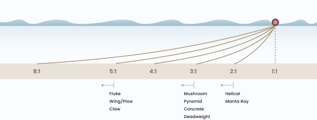 This diagram shows the scopes recommended for use with different types of anchors. For example, a helical anchor only requires a 2:1 scope, but a fluke anchor requires a 5:1 scope.