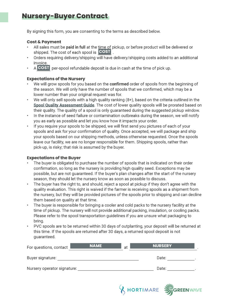 It is important for you as a seller to set and communicate reasonable expectations to your buyers. One way to do this is through a contract. The contract does not need to be long or complicated, but it does need to clearly outline what both the nursery and farmer can expect from each other and where the nursery’s responsibility ends and the buyer’s responsibility begins. Send this contract to the farmers when you confirm their spool order. The contract should include points on pricing, timing, seed quality, a chain of custody of spools (i.e. who is responsible for the spools at what points), and what happens if your seed does not meet the farmer’s standards. We’ve included a sample contract below. Use this as a guide to draft your own contract that reflects the terms and best practices of your nursery operation.