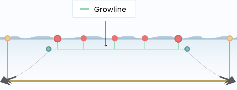 As sugar kelp grows, it becomes heavier and heavier, eventually weighing down the growline so much that, without any flotation, it could sink to the bottom. The growline buoys counteract this force by holding the kelp at the proper depth for ideal growth conditions, typically around 5-6 feet below the surface of the water. The growline buoys also provide an access point to the kelp, allowing the farmer to lift the growline to the surface and inspect the kelp without disturbing its growth. This diagram depicts a typical 200-foot growline with three growline buoys, attached at intervals of 50 feet. In the Farm Design Tool, we recommend using a buoy every 50-65 feet.
