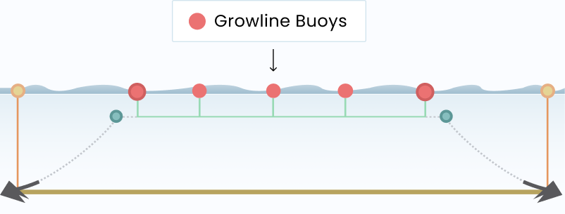 In the diagrams below, you can see both an aerial and profile view of this array design. Notice the three main components of the system: the growline, the buoys, and the anchors.