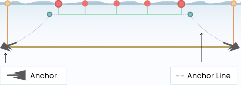 The anchors are what tether your array to the seafloor, hold it in place, and help maintain tension. The anchors are connected to the growline by an anchor line and, sometimes, a length of chain. Together, the segment that attaches the floating portion of the array to the anchor on the bottom is called the anchor rode