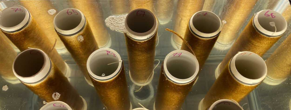 At GreenWave, we keep track of each spool by marking its inner lip with a unique number. These numbers are also useful as an indicator of whether the spools are in the correct position. In the photo you can see that the numbers are all oriented the same way, so we know that each spool has been turned in this tank.