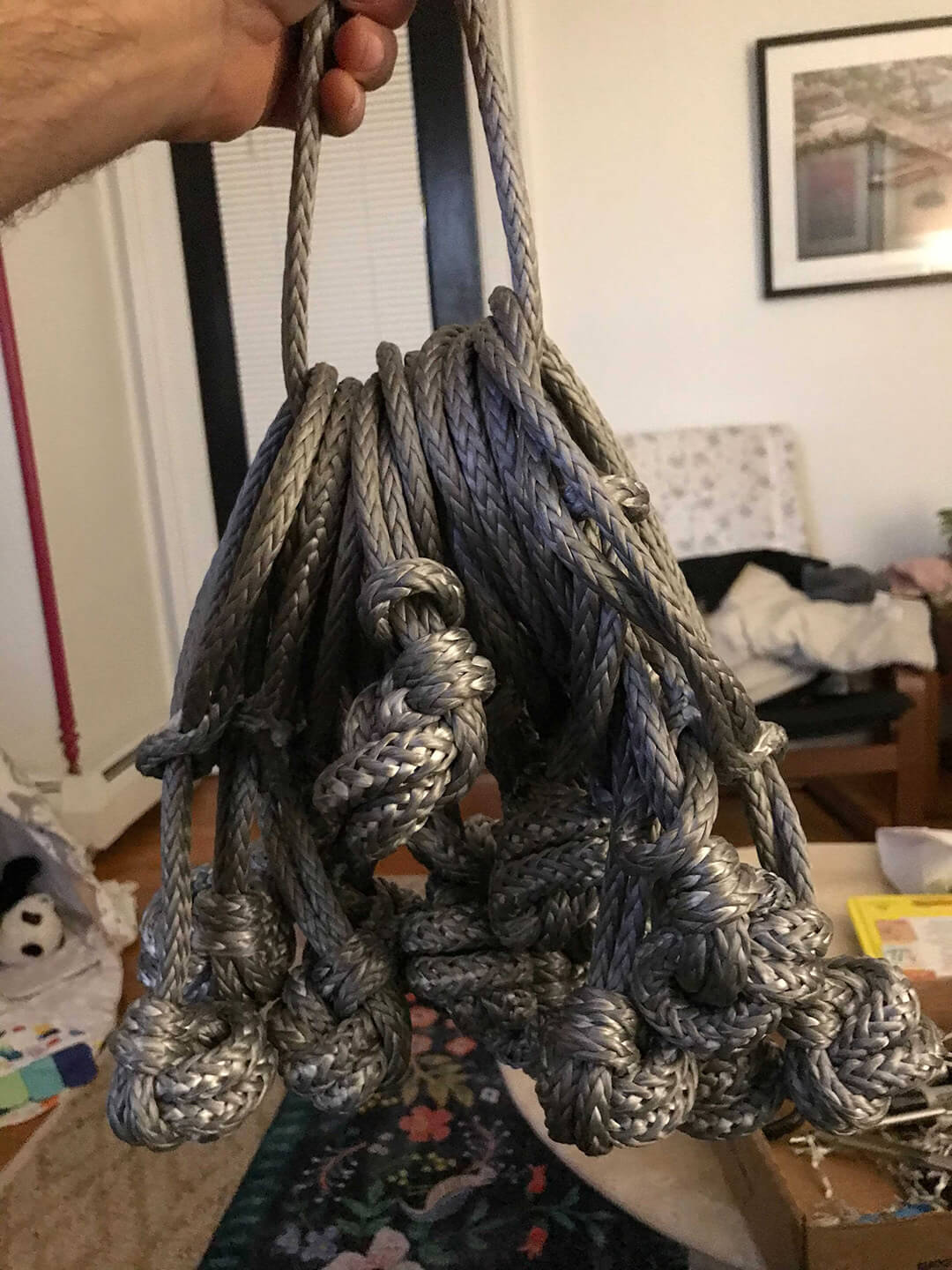 On the GreenWave farm, we use soft shackles as an alternative to hardware to link different gear components within the array system near the surface. Soft shackles are essentially a braided ring, made from Dyneema line, which is 15-times stronger than steel and can be used in place of a shackle, thimble, or metal ring.1 We find they are exceptionally useful for connecting different parts of the system in the water, so you can tie fewer knots, be more precise with the measurements of different components of the system, and have fewer points of failure. We use them to connect our anchor line to our 5-line array bridle, splice them into our growlines at intervals to connect with buoy lines, and keep a bucket of them around to have at the ready for other needs.