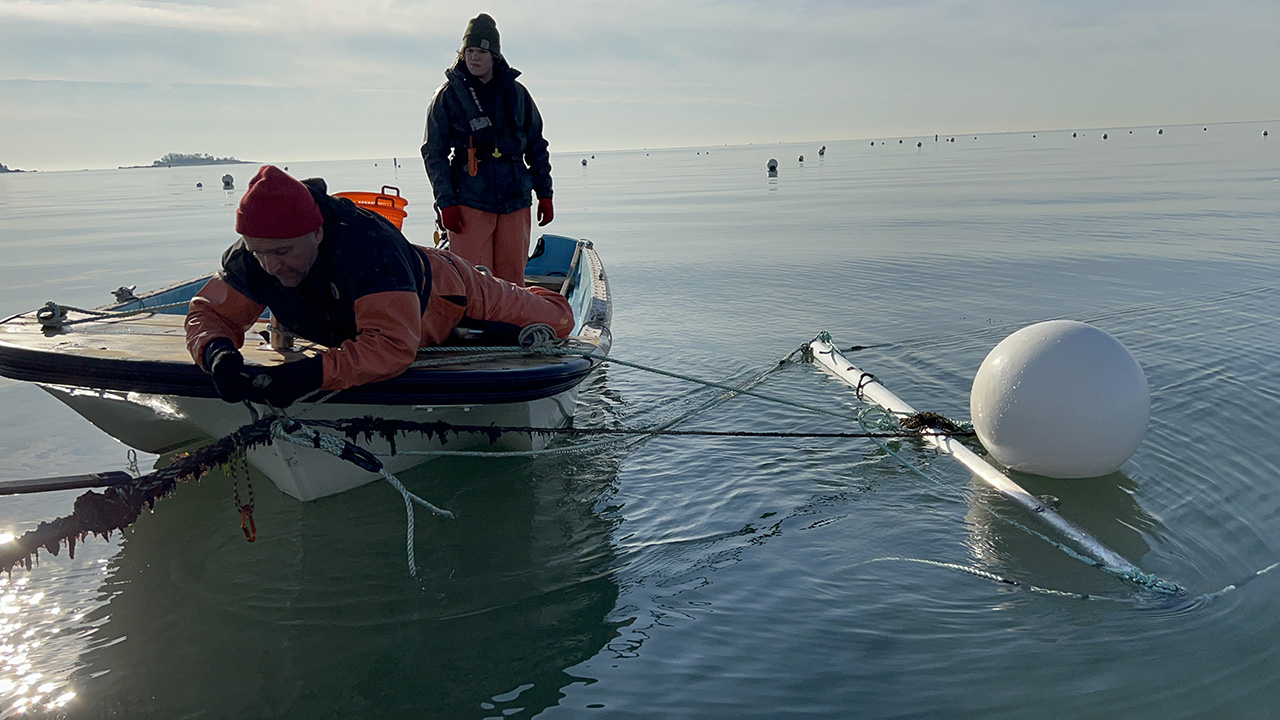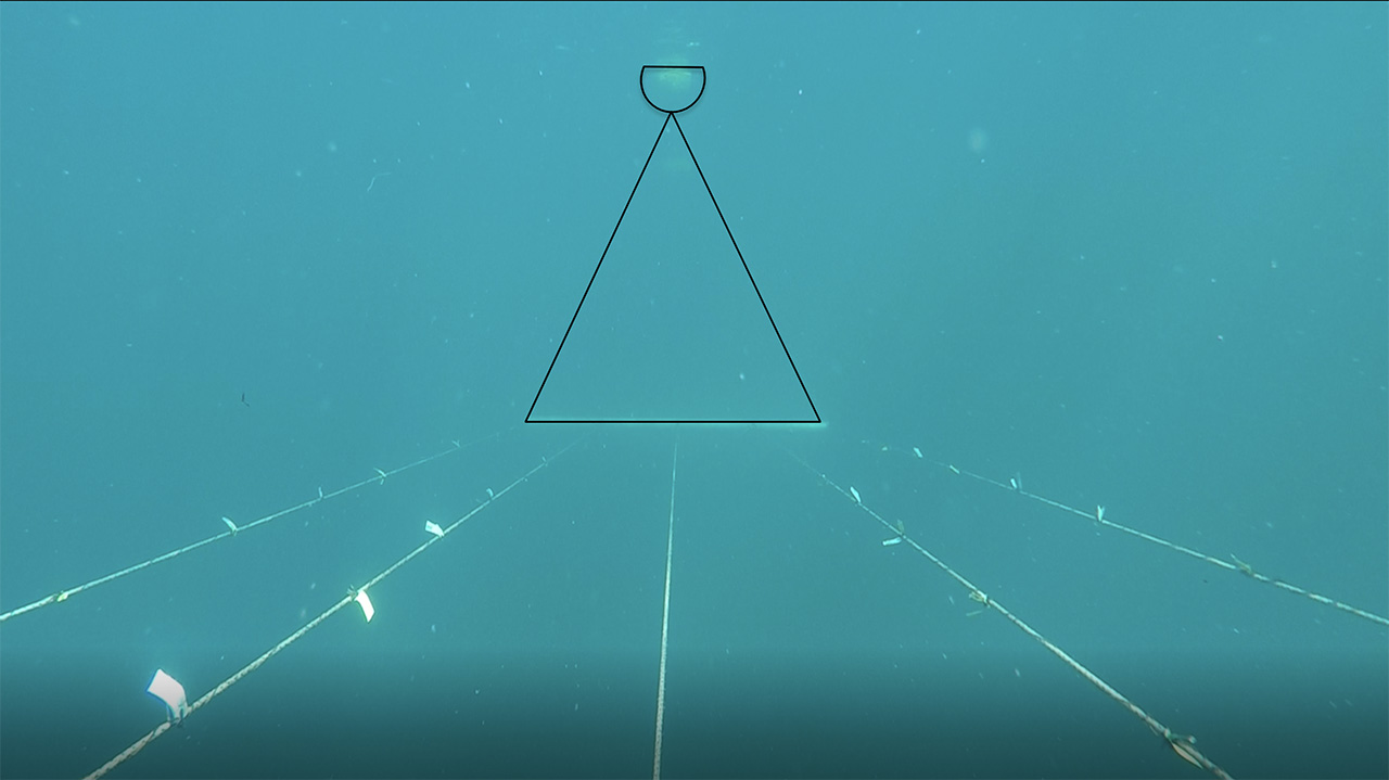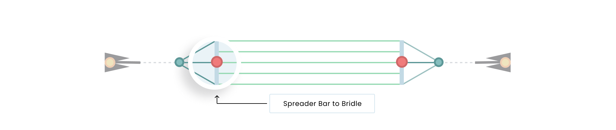 On the upward-facing side of the spreader bar, two eyes are welded on either end, which connect to bridle lines that run upward to a buoy on the surface, which provides flotation. It’s important to double-check that these bridle lines are perfectly matched in length to ensure that the array hangs straight in the water and doesn’t sit tilted.