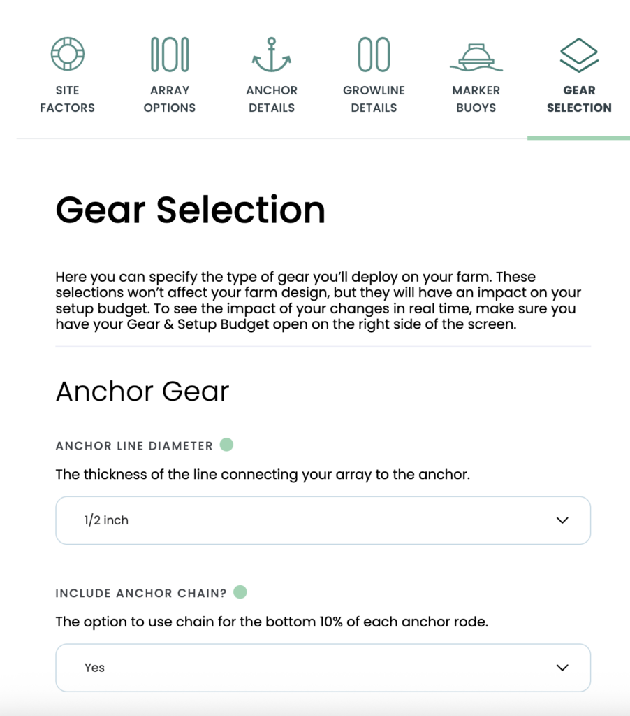 In the Farm Design Tool, you can indicate some of your gear selections in the Anchor Details and Gear Selection tabs. If you don’t make any changes, these fields are pre-populated with industry standards. One of the goals of the Farm Design Tool is to help you better understand how the myriad of farm inputs affects your final design and, ultimately, your startup costs. We’ve included info bubbles within the tool to give more context on each individual gear item. For a deep dive into the common gear types used in ocean farming read the next course on Gear Selection.