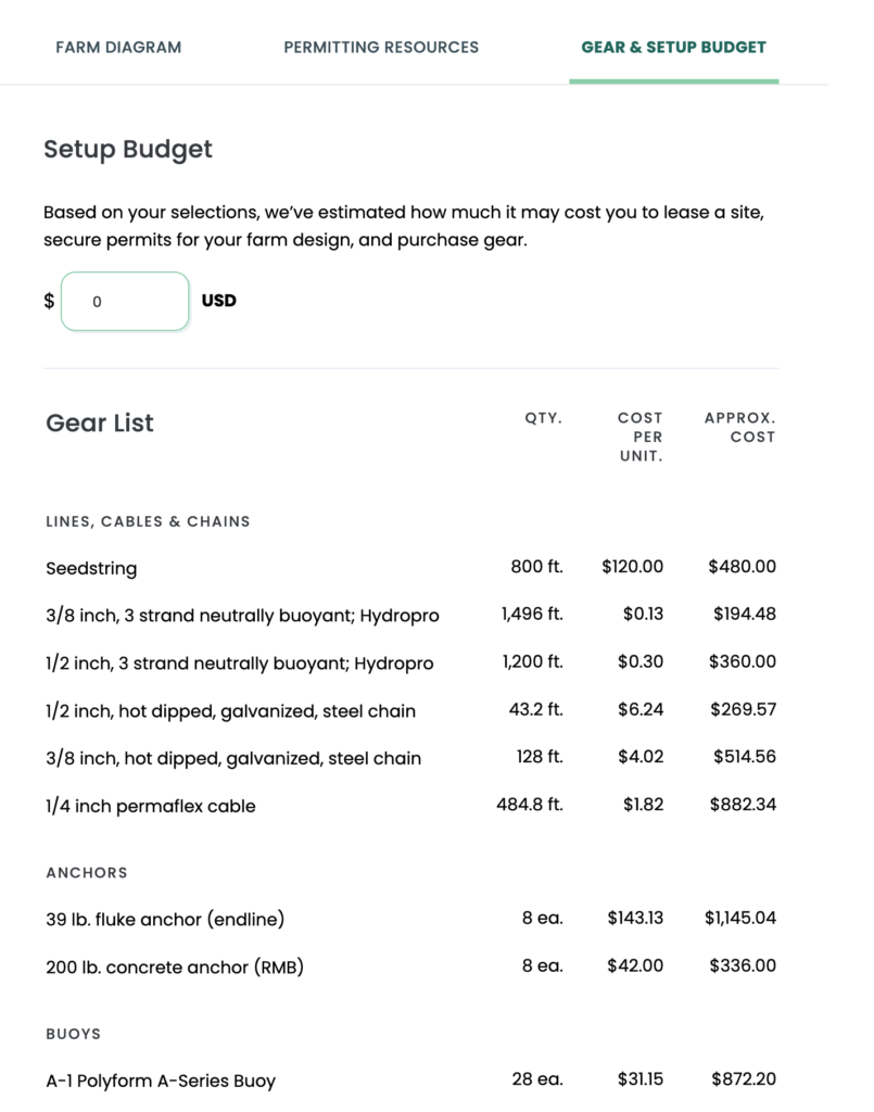 The Gear and Setup Budget of the Farm Design Tool gives you a general idea of how much it would cost to build your farm if you were to purchase all of the equipment new and apply for a lease and permit in your state. The itemized gear costs will update as you change your site factors or gear selections on the left-hand side of the tool. You can download the Gear and Setup Budget into an Excel document and update it to fit your exact needs.