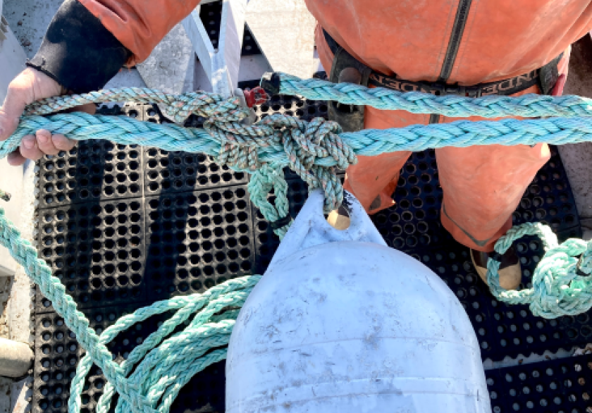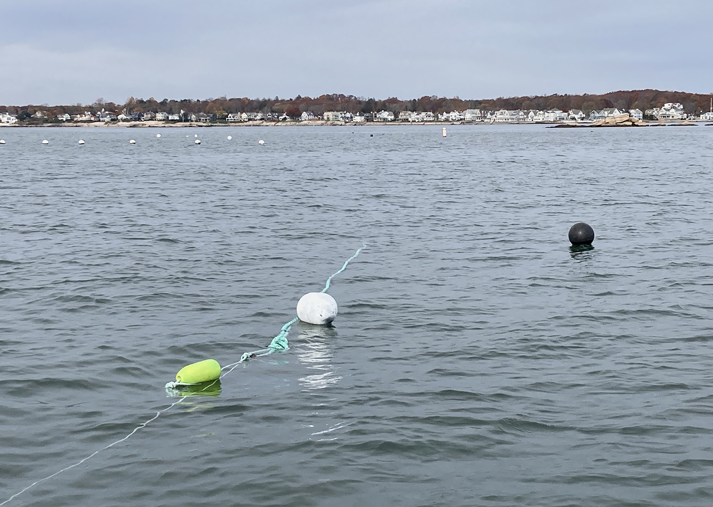 When the system isn’t under tension, the tensioning buoy can be seen from the surface. In this image the green cork marks the loop at the end of the anchor line, the white buoy is the tensioning buoy, and the black buoy is at the end of the tag line attached to the anchor.