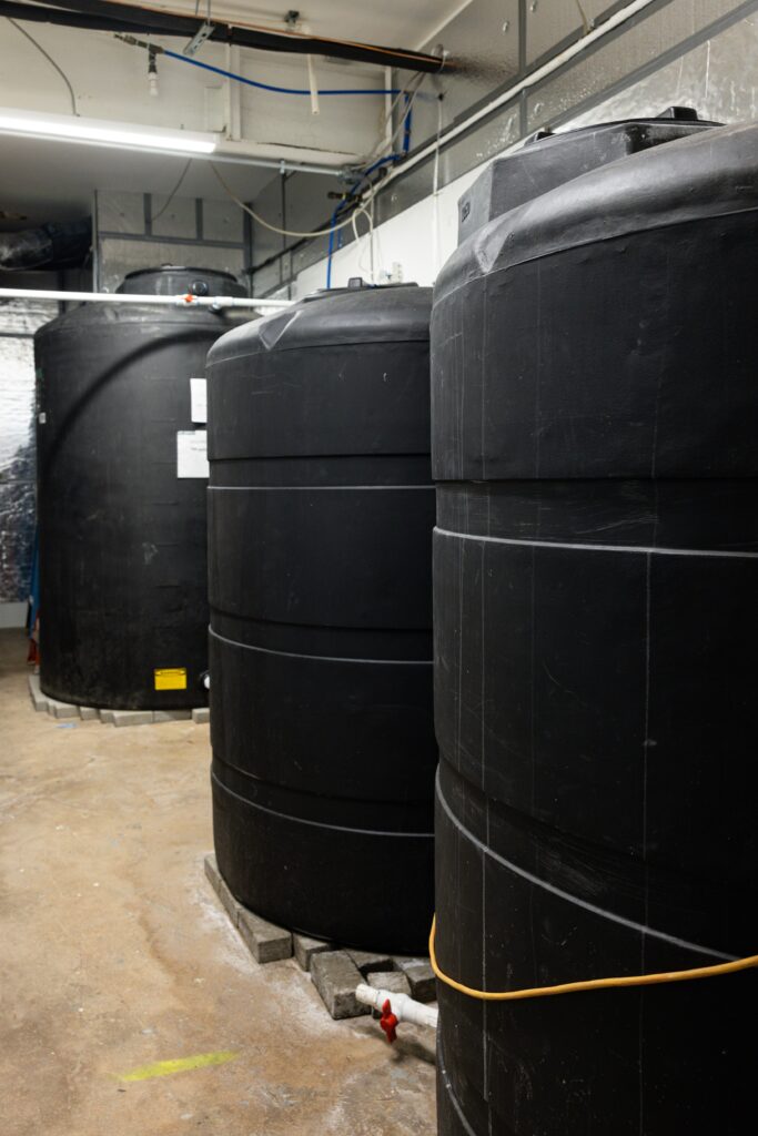 After this initial filtration, water is piped into a 500-gallon skimming tank. These tanks should be made from a type of plastic that doesn’t let light pass through. To check if any light is getting through, shine a powerful LED light on the tank. If you see light coming through, don’t worry! You can fix this by applying a special primer that sticks to multiple surfaces and then adding three coats of black paint. This will make the tank completely opaque, which is important for the process.