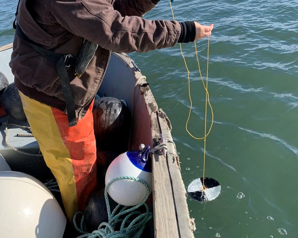 Water clarity can be measured with a low-tech Secchi disk – a black and white disk with a string attached. Lower the disk into the water and record the length of the string when the color pattern is no longer visible to the naked eye. This gives you a reading for the depth of water clarity at your site. Water clarity impacts the depth at which you keep your lines to optimize access to light. Keep in mind that water clarity may change during different times of year and after storm events and runoff.